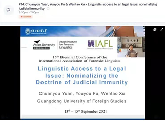 2021年9月13日至15日,为期三天的“第十五届国际法律语言学家协会双年会(IAFL15)”线上会议顺利召开。本次会议由国际法律语言学家协会(International Association of Forensic Linguists,简称“IAFL”)主办,由英国伯明翰阿斯顿大学的阿斯顿法律语言学研究院(AIFL)承办,是法律语言学领域两年一度的国际顶级学术会议。大会通过提前上传视频、会上实时问答、会后观看录像等方式在线上举办,来自全球多个国家的110余位法律语言学学者相聚云上,共享这场学术交流盛会。公司袁传有老师、徐优平老师、张少敏老师,法律语言学方向的博士研究生罗兴、付悠悠和许文涛,研二及研三多位硕士研究生参加了此次学术盛会。20名广外师生组成了庞大的广外代表团,在本次会议上分享了中国的法律语言学研究成果,彰显了广外的研究力量。